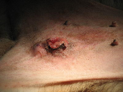 圖03:乳房腫瘤,並且在表面形成潰瘍灶(嘉興動物醫院)