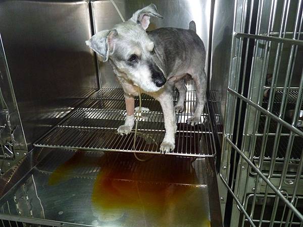 圖01:住院第一天,血紅素尿的狀況相當嚴重。(嘉興動物醫院)
